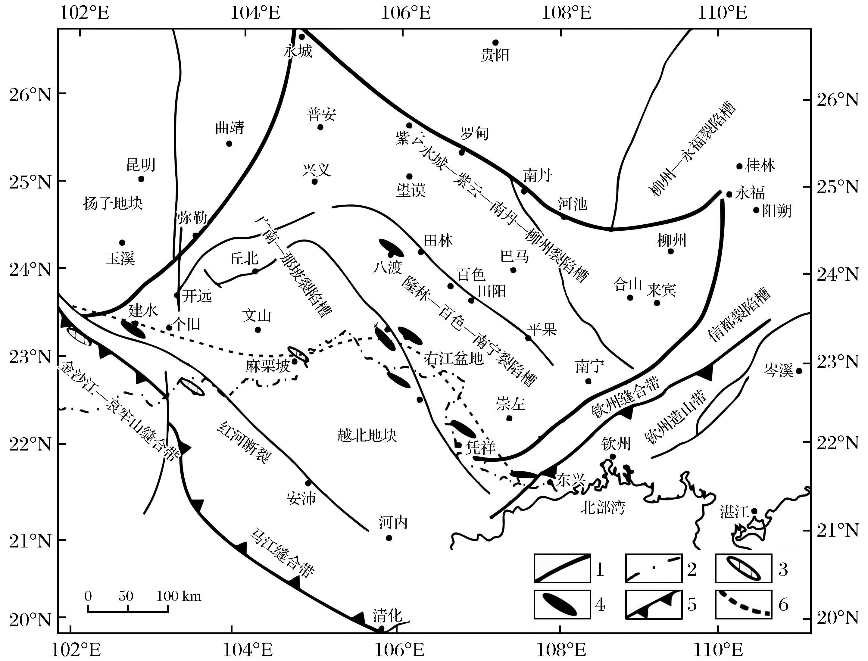 | 图1 中国滇黔桂及周邻区卡林型金矿大地构造图( 1.断层;2.国界;3.蛇绿岩;4.火山岩;5.缝合带;6.推测八布缝合带 |