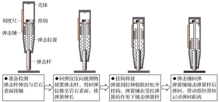 回弹仪测定材料强度特性参数的原理:一个坚硬物体的表面受到另一个物体的撞击时会发生弹性变形,恢复力会使得撞击物体发生回弹现象。回弹仪测试岩石强度的具体过程如图1所示。回弹仪内的弹簧在突然释放状态下驱动弹击杆撞击岩体表面,所产生的瞬时弹性变形的恢复力反过来压缩弹簧使弹击杆弹回,回弹仪的数字显示器中显示弹击杆回弹的距离。通过回弹值作为岩体抗压强度相关的指标之一,来推断岩石的抗压强度。回弹值实际反映的是岩体的表面硬度。岩石强度越高,表面硬度也越高,二者之间具有一定的相关性。岩体表面的风化也会影响回弹值的大小。因此,使用回弹仪测定岩体表面硬度后就可以根据测区岩体强度换算公式,推测出岩石的单轴抗压强度和弹性模量。