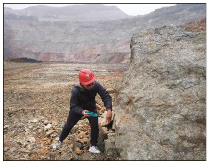 根据铜矿采场盘区的分布情况和采场施工进度,整个测试从北面台阶开始,经南面台阶,由浅部至深部进行。在台阶上选择块体较为完整且表面相对平整的岩体,在清理岩体表面的粉尘和氧化层后,对其进行回弹测试。测试时采用用户自定义方案,在一个台阶范围内根据台阶面积选取10~20个测量点,并在每个测量点50 cm×50 cm范围内测量20个单点数据。现场测试过程如图3所示。