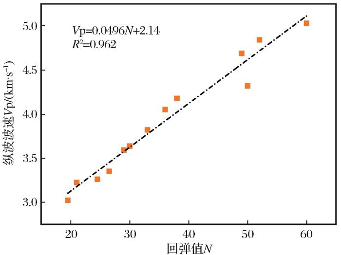 (2)测试区域内岩石纵波波速范围为3 026~5 030 m/s,该铜矿内岩石纵波波速与回弹值之间呈线性正相关关系,相关系数为0.962,因此可通过测试回弹值快速、准确地获取岩石的波速大小。