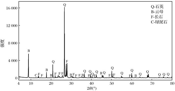 试验选用的岩样为粗粒花岗岩,取自湖南某采石场。根据国际岩石力学学会标准,将大块花岗岩样品制成φ50 mm×100 mm的圆柱形试样(Fairhurst et al.,1999)。通过X射线衍射试验对样品成分进行分析(图1),得出岩样的组成成分为石英(38.4%)、云母(20.7%)、长石(39.1%)和绿泥石(1.8%)。