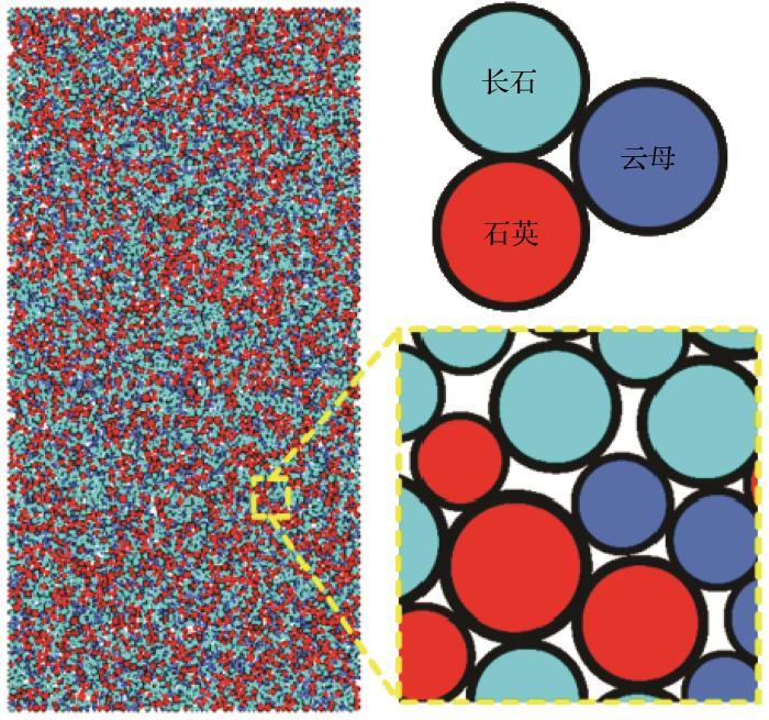 模型的构建过程包括离散元表征模型和微观参数标定。试验使用的花岗岩主要成分有石英、长石和云母,而绿泥石含量较少,所以绿泥石对试验结果的影响可忽略不计。使用微观颗粒的真实粒径进行模拟时会使得计算较为困难,本文采用的粒径范围如下:石英为0.4~0.5 mm,长石为0.4~0.5 mm,云母为0.3~0.4 mm(Yin et al.,2018)。据此构建离散元的二维表征模型,如图3所示。