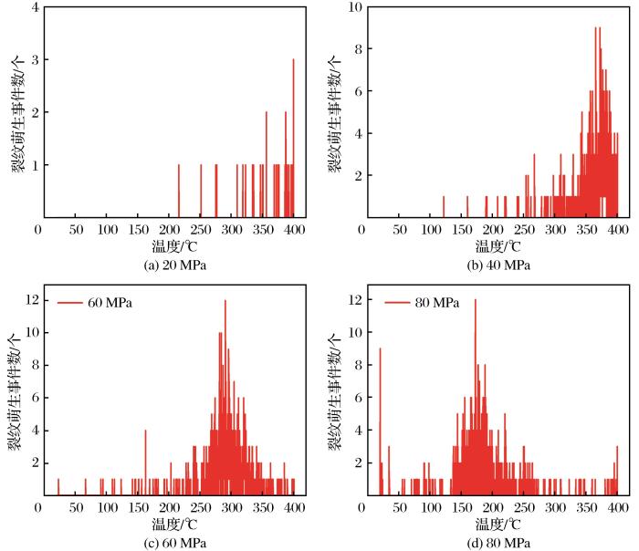 裂纹萌生事件数随温度升高而逐渐变化。如图8所示,当轴压为20 MPa时,模型在热处理过程中仅产生少量的裂纹,起裂温度为216 ℃,最终产生的热裂纹较少,没有裂纹剧烈扩展现象;当轴压为40 MPa时,起裂温度为122 ℃,裂纹扩展温度区间大致为300~400 ℃;当轴压为60 MPa时,起裂温度为22 ℃,裂纹扩展温度区间大致为250~350 ℃,该轴向应力状态已接近花岗岩的起裂强度,较小的温度变化,就会引发岩石内部的微裂纹剧增并连接形成宏观裂隙;当轴压为80 MPa时,岩石起裂温度近似为20 ℃,裂纹扩展温度区间大致为150~250 ℃,岩石中已经出现了裂纹,任意的温度变化均会导致岩石起裂。