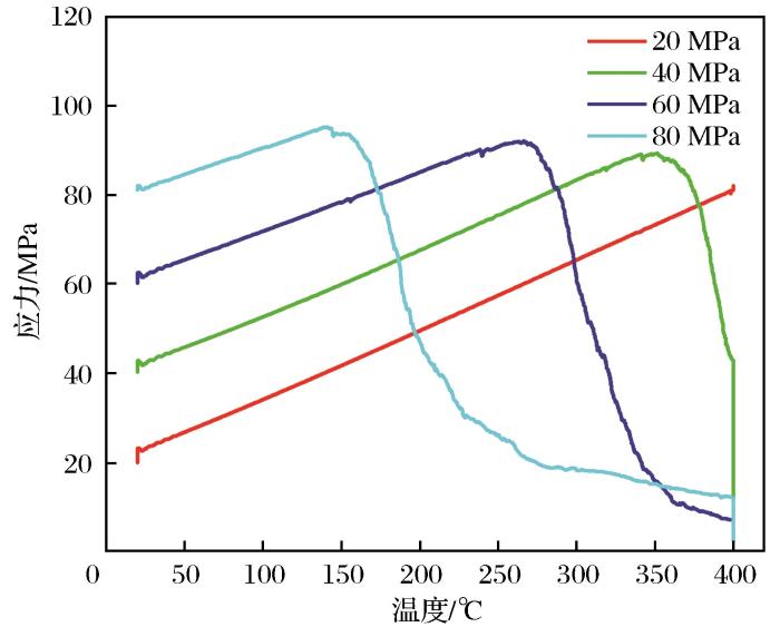 与岩石起裂特征值的相关研究进行类比,定义相关热特征值,即:一定的初始应力状态下,在热处理过程中,随着温度的逐渐升高,达到某个特定温度时出现裂纹,此时的温度称为该应力状态下的起裂温度。随着温度继续升高,会经历一个裂纹剧烈扩展的阶段,这个温度区间为裂纹扩展温度区间。初始应力场和热应力场叠加后,轴向应力增加,当轴向应力达到最大值时,此时的应力和温度分别为峰值热应力和峰值温度。以上参数统称为热特征值。