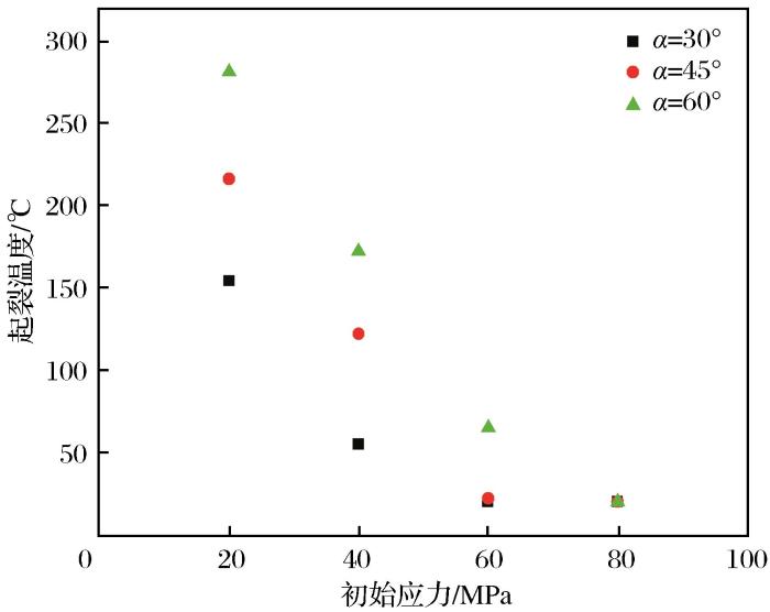 (1)起裂温度。如图10所示,随着模型轴向初始应力的增加,起裂温度逐渐降低,表明较高的初始应力状态会使得模型起裂的热敏感性增强。在含有3种不同角度预制裂纹的模型中,当初始应力较低(20,40 MPa)时,起裂温度高低顺序分别为60°>45°>30°。当初始应力达到60 MPa时,30°和45°的起裂温度接近;当初始应力达到80 MPa时,三者的起裂温度均较为接近,表明初始应力较大时预制裂纹的角度对模型的起裂温度影响较小。