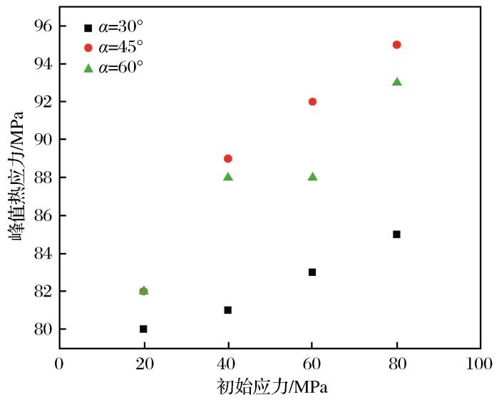 在相同的初始轴向应力状态下,含有不同角度预制裂纹的岩石,在初始应力场和热应力场的叠加过程中,受预制裂纹角度α的影响,其热敏感性有明显差异,随着α的增大,岩石的热敏感性降低。主要表现在:(1)α逐渐增大,热裂纹萌生的峰值温度区间会逐渐向后移动,表明随着α的增大,热裂纹剧烈萌生需要更高的温度。(2)α逐渐增大,其峰值温度和峰值热应力逐渐增加,当α较大时,峰值温度接近400 ℃,当α较小时,峰值温度则较低。较大的预制裂纹角度会使岩石热裂的进程增加,加热至较高温度才能引起宏观破坏。(3)起裂温度随着α的增大而逐渐增加,当α较小时,起裂温度接近20 ℃,较小的温度变化均会有热裂纹萌生,当α较大时,需要加热至较高温度,才有热裂纹萌生。