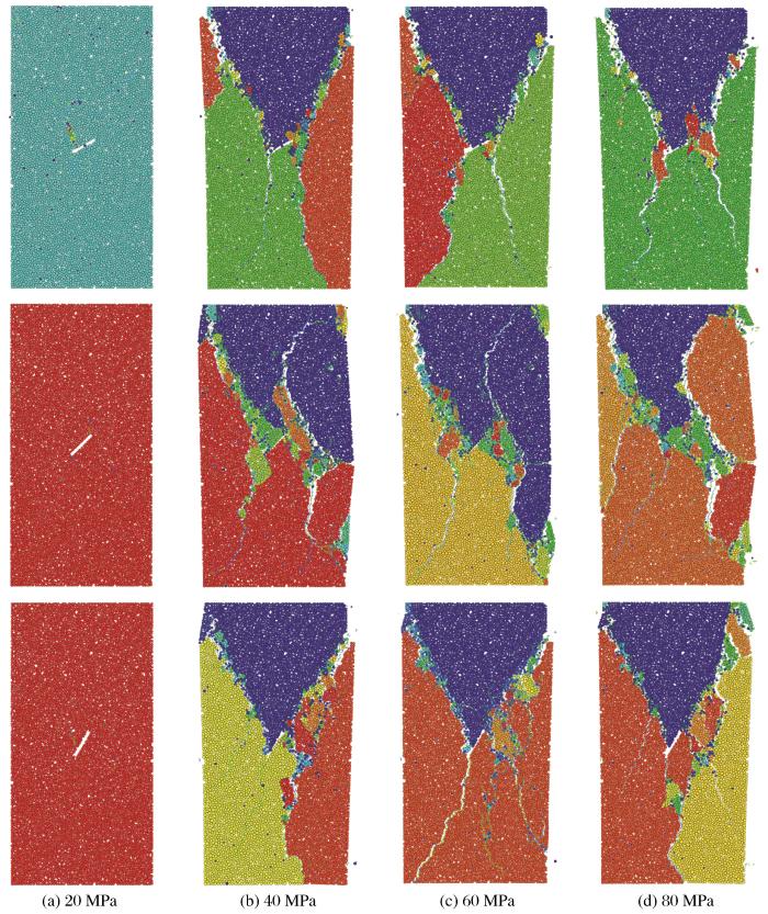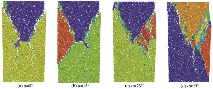 含有预制裂隙的模型中,新裂隙萌生方向与预制裂隙端部颗粒的排列方式有关,本文考虑在颗粒排布方式相同的条件下发生的裂纹扩展。当裂隙尖端的应力集中达到一定程度,裂纹随之扩展(蒋明镜等,2014)。图16所示为含不同角度预制裂纹的模型在不同初始应力状态下热力致裂的破坏状态。在较低的应力(20 MPa)状态下,加热结束后,仅有少量裂纹分布在预制裂隙的端部,无法产生明显破坏。在不同的高初始应力(40,60,80 MPa)状态下,热力致裂的最终破坏模式基本相似,能够观测到翼裂纹和次生裂纹。结果表明,对一定初始应力状态下的岩石进行加热,轴向应力表现为与单轴加载相似,热力致裂的最终裂纹扩展模式与初始应力的大小无关。