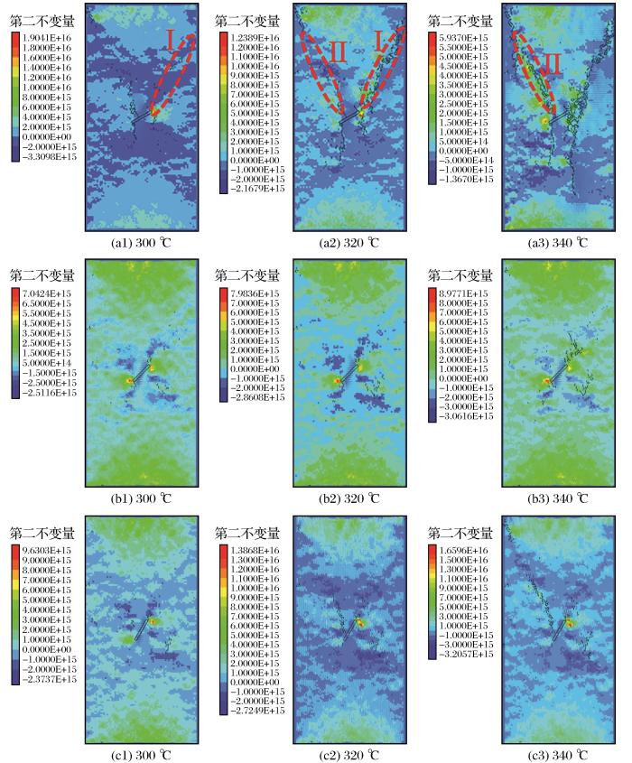 裂纹扩展的最终结果与初始应力状态的大小无关,当初始轴向应力为20 MPa时,模型中最终裂纹结果中数量较少,裂纹扩展阶段应力变化不明显,故选取初始应力状态为40 MPa下的模型进行应力集中方式研究。在不同应力状态下,应力集中均会随温度的升高而不断变化,且含有不同角度预制裂隙的模型裂纹扩展温度区间也不相同,在不同的裂纹扩展温度区间中的重叠部分内选取一个相同温度区间(300~340 ℃)。如图18所示,对该温度区间下的起始温度(300 ℃)、中间温度(320 ℃)和终止温度(340 ℃)进行不同角度预制裂隙模型的第二不变量对比研究。图18(a1)所示为第二不变量在温度为300 ℃时的分布状态,在此温度下,“Ⅰ”区内的第二不变量值较小,当温度升高至320 ℃后,第二不变量分布如图18(a2)所示,“Ⅰ”区内的第二不变量值明显增大,根据