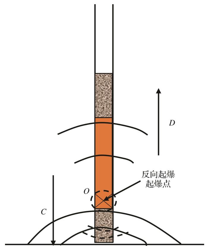 深孔VCR法切槽爆破通过多个柱状药包形成爆破漏斗的轮廓线,构成了短延长药包的爆破漏斗,故装药长度不宜过长,以确保每个柱状药包的爆炸能量均能被有效利用。如图2所示,在O点处起爆后,爆破产生的爆轰波以速度D向孔口方向传播,以速度C向底部自由面方向传播,当向底部传播的爆炸应力波遇到自由面后,产生反射拉伸波,在爆轰波和反射拉伸波的共同作用下实现爆破漏斗范围内的岩石破碎。