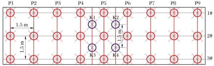 为实现中央掏槽孔的爆破,需要在掏槽炮孔之间施工空间补偿孔,作为中央区域掏槽爆破的补偿空间和自由面。如图5所示,将切割立槽中央区域的P4排、P5排和P6排炮孔作为掏槽孔先爆破,在这3排炮孔中央施工4个空间补充炮孔,空间补偿孔直径为100 mm,空孔与掏槽孔的间距为1.0 m,相邻空孔的间距为1.5 m。