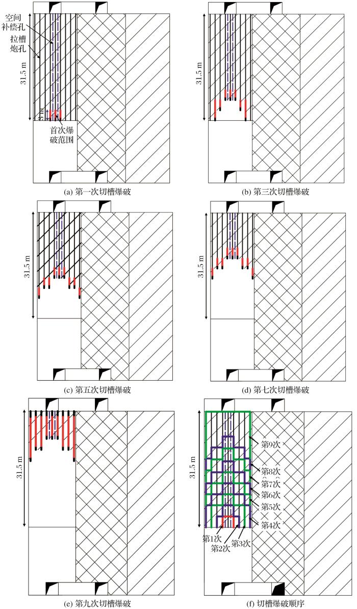 第一次爆破时,先爆破切割槽中央位置一定范围内的炮孔,装药爆破高度为3 m,中央掏槽孔爆破后,即在中央位置形成了一个分段切割井,为其两侧炮孔的爆破提供侧向自由面和爆破补偿空间。将传统深孔VCR法爆破由单自由面爆破变为底部和侧向双自由面爆破,自由面的增加将改善爆破破岩效果,降低深孔VCR法爆破的夹制作用。从第二次爆破开始,均呈“品”字形爆破形态。该方法成功的关键是中央掏槽孔的爆破和“品”字形爆破的形态控制。