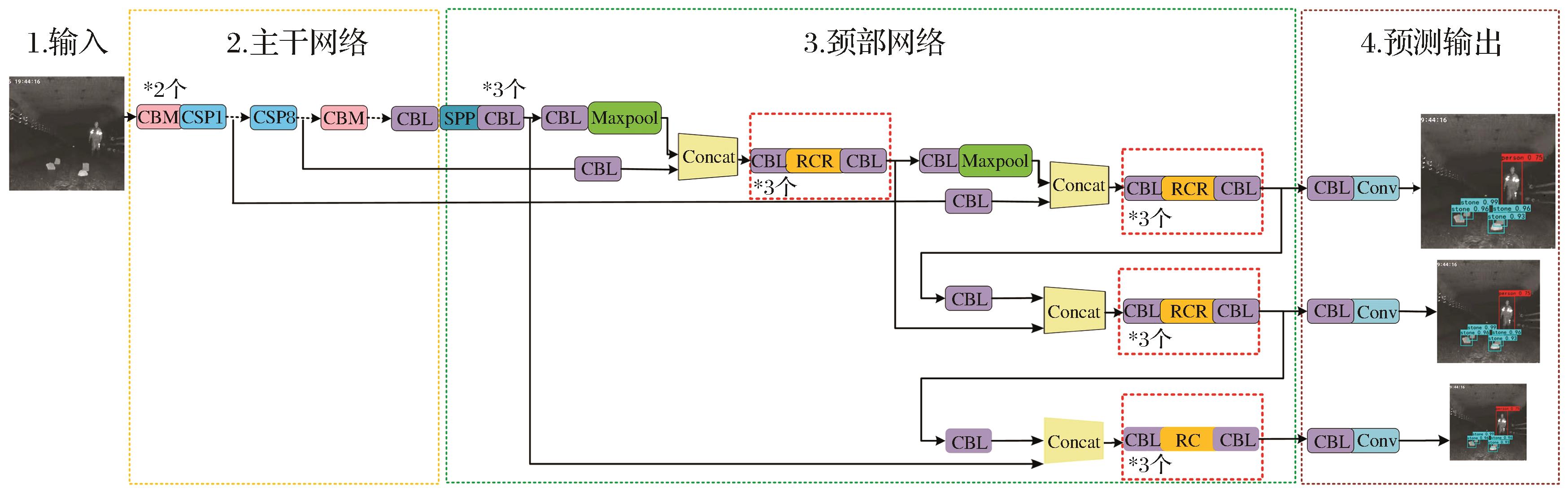 | Fig.1 RCR-YOLOv4 network structure of roadway obstacle detection model |