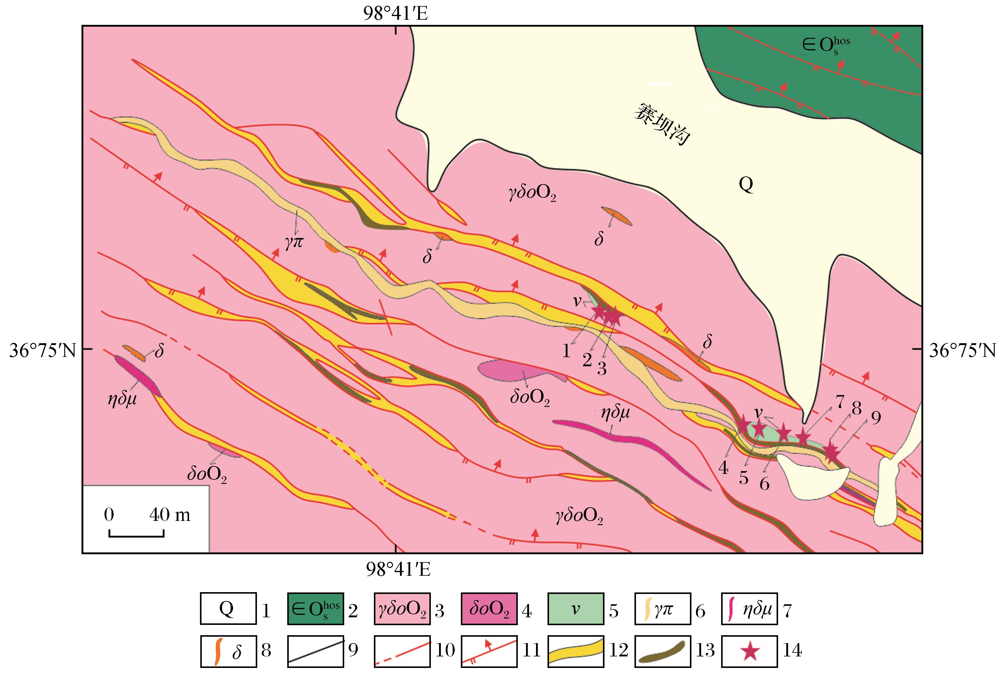 | 图3 赛坝沟金矿地质图(据 1.第四系;2.斜长角闪岩;3.英云闪长岩;4.石英闪长岩;5.辉长岩;6.花岗斑岩;7.二长闪长玢岩;8.闪长岩脉;9.地质界限;10.断层及推测断层;11.逆断层;12.碎裂岩化蚀变破碎带;13.金矿体;14.采样点 |