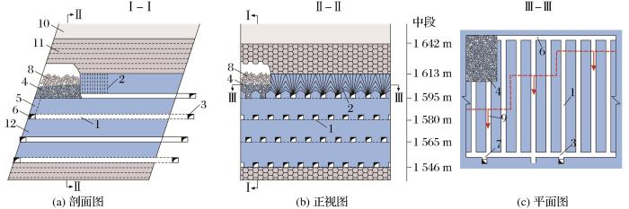 ... 为了揭示崩落法采场顶板冒落机理及其发展过程,近年来国内外矿业领域专家采用理论计算(李海英等,2020;谷拴成等,2012)、试验研究(付建新等,2020;曹建立,2017;Wang et al.,2014)、数值计算(Tan et al.,2018;Li et al.,2014;Xu et al.,2016)及现场监测(何荣兴等,2015;侯公羽等,2020;刘建坡等,2021)等方法对这一问题进行了研究.结果表明,顶板冒落机制可划分为拱形冒落、筒状冒落、柱塞式冒落和沿破碎带的抽冒等几种类型,而顶板矿岩结构、强度、矿区地质构造、应力大小及方向、采空区形态及规模、空区埋深和回采顺序等因素均会对顶板的冒落发展产生明显影响.不同顶板冒落模式对崩落法采矿安全产生的影响也不同,如拱形冒落一般按周期向上发展,在冒透地表前,其一次冒落量有限,对采场产生的危害也较小(Vyazmen-sky et al.,2010);筒状冒落和柱塞式冒落通常可一次冒透地表,具有一次冒落量大、易产生矿震和冲击气浪危害的特点(He et al.,2015).由此可见,崩落法采场顶板围岩的冒落机理及冒落形式多种多样,冒落产生的危害及其控制难易程度也各不相同. ...