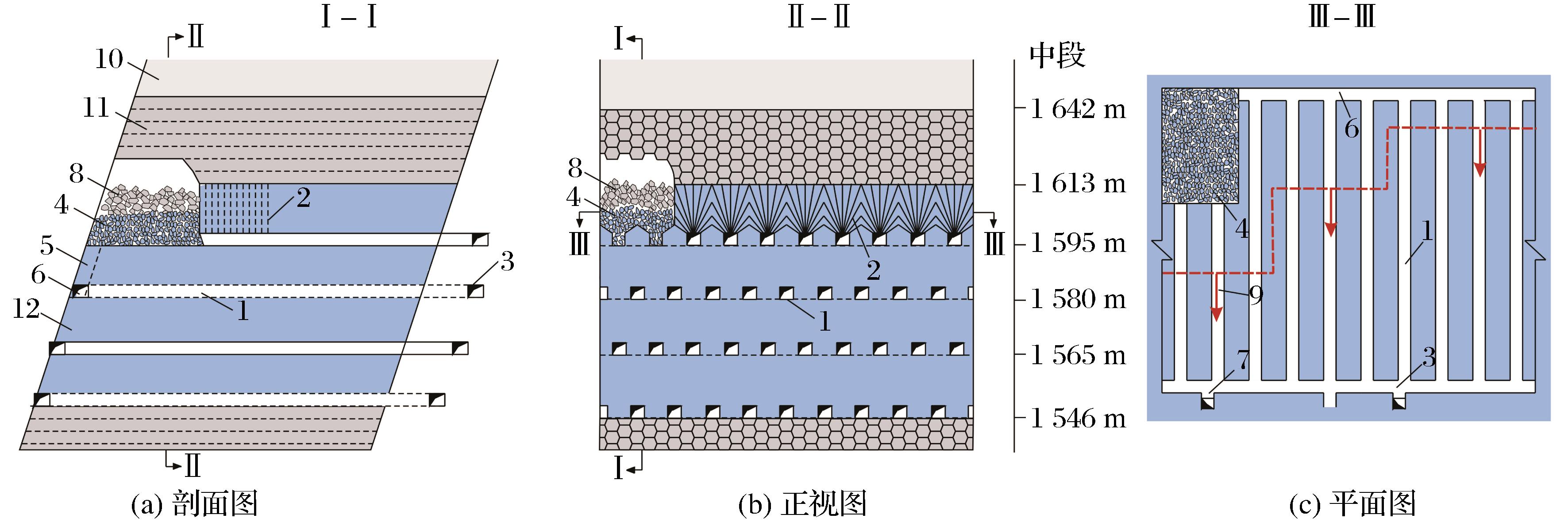 | 图1 龙首矿西二采区胶结充填体诱导冒落覆盖层形成方案 1-回采进路;2-扇形孔炮排;3-下盘沿脉巷道;4-矿石散体垫层;5-切割立槽;6-上盘切割平巷;7-溜井;8-冒落胶结充填体;9-阶梯式退采方向;10-片麻岩;11-胶结充填体;12-矿体 |