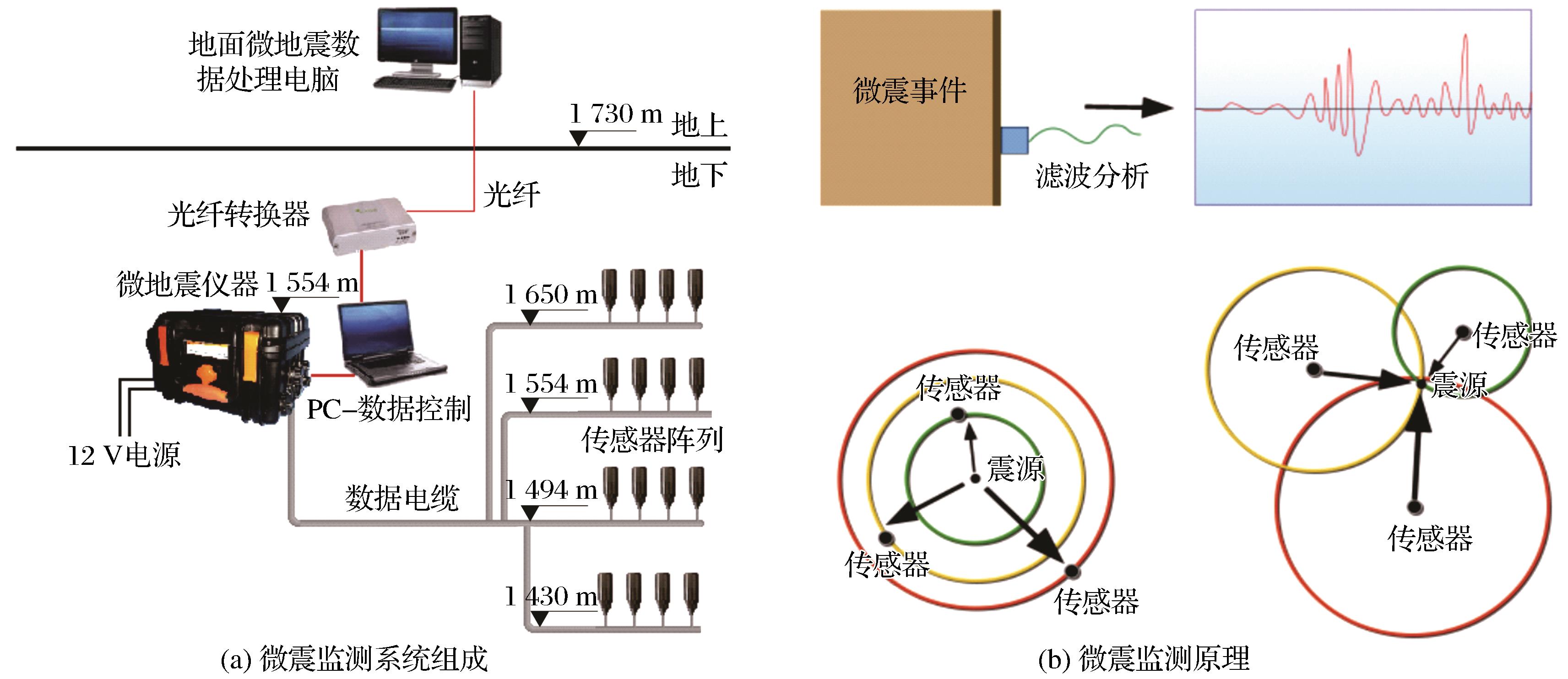 | Fig.2 Composition of mine micro-seismic monitoring system and micro-seismic monitoring principle |