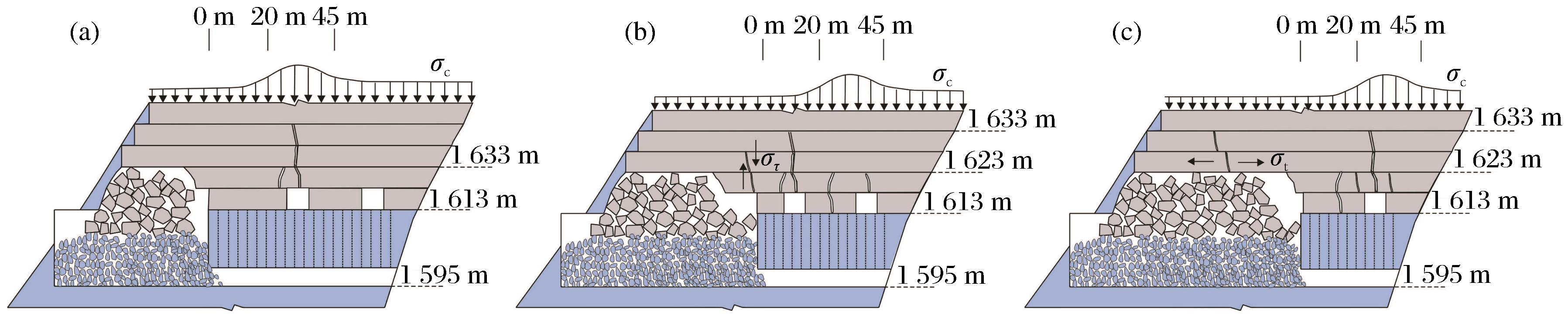 | 图6 顶板胶结充填体破裂强微地震事件发生位置及其机理 (a)崩落法采空区后方(10~45 m)产生应力集中致使胶结充填体发生破坏(第一类事件);(b)胶结充填体岩梁在采空区后方边界处发生剪切破坏(第二类事件);(c)胶结充填体岩梁中部发生下沉弯曲拉伸破坏(第三类事件);σc-垂向压力;στ-剪切应力;σt-拉应力 |