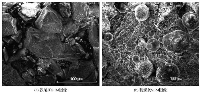 使用多因素分析仪测定铁尾矿和粉煤灰的pH值分别为8.79和8.95,说明铁尾矿和粉煤灰是弱碱性工业固体废弃物。使用BT-2003型激光粒度分析仪分别测定铁尾矿和粉煤灰的颗粒组成,测定中铁尾矿使用的分散剂为蒸馏水,粉煤灰使用的分散剂为无水煤油。测定结果见图1。