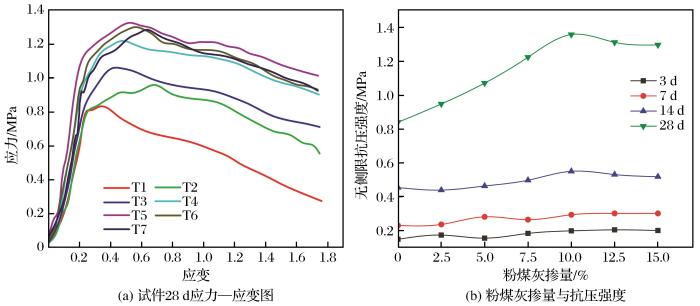 使用Origin软件绘制7组试件养护28 d的应力—应变曲线,如图4(a)所示,由图中数据可知,当粉煤灰掺量为0~10%(T1~T5组)时,试件的抗压强度随着粉煤灰掺量的增大而增强,但当粉煤灰掺量继续增大(T6和T7组),试件的抗压强度则略有降低。