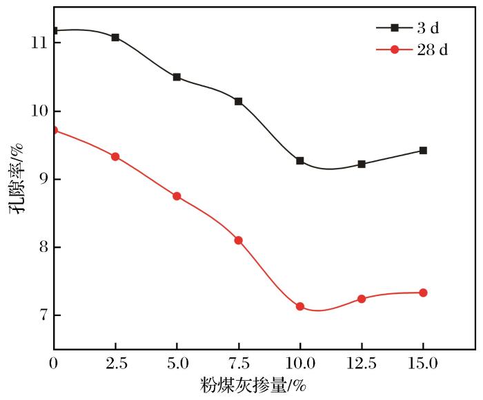 孔隙结构影响着膏体材料的性能(Das et al.,2011)。由表3可知,随着粉煤灰的掺入,试件的孔隙率明显下降,当掺入量达到10%时,养护28 d试件孔隙率最低,当掺入量达到12.5%时,养护3 d试件孔隙率最低。