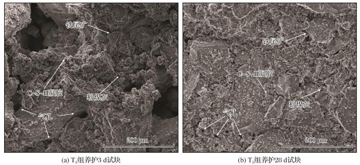使用扫描电子显微镜观察膏体材料的微观结构(Wang et al.,2017;Meng et al.,2016;Paiva et al.,2017),发现高孔隙度会使膏体材料中的界面过渡区成为薄弱部分(Scrivener et al.,2004)。由图7可以看出,随着养护龄期的增加,材料中胶凝活性材料逐渐水化减少,C-S-H凝胶逐渐增多,生成的C-S-H凝胶可以填充进试块中的孔隙,使试块变得愈加致密,几乎没有明显缺陷。图7所示分别为养护龄期3 d和28 d的T1组和T5组SEM图像,由图7可知,粉煤灰使得试块结构更加均匀,孔隙率大幅降低,仅保留部分气孔。