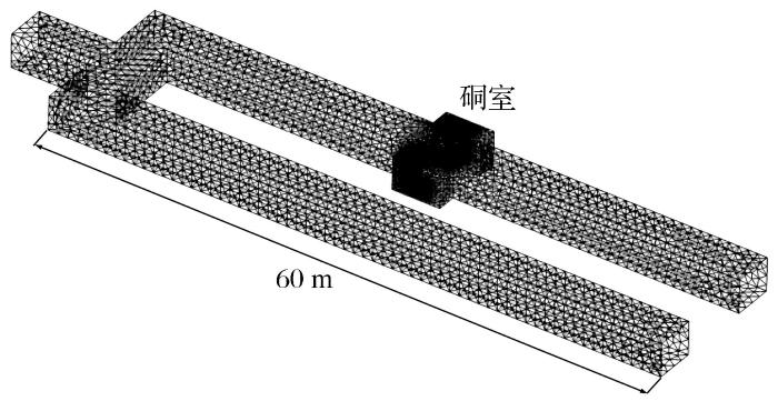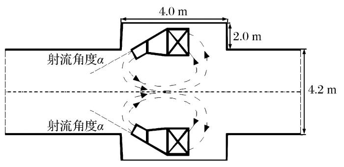 综上所述,国内外研究主要针对单风机空气幕开展理论研究与技术应用(王海宁等,2007;刘成敏等,2015)。然而,单机风幕难以高效地截断、引射风流,不易实现风流调控(Luo et al.,2013;Gao et al.,2012)。Gupta et al.(2006)通过试验改变空气幕的射流角度和排烟风速,对双边空气幕阻隔效率进行讨论,发现采用双机并联的方式对巷道风流进行控制的效果明显优于单机风幕,可实现对巷道风流的阻隔、引射和增阻等调节(吴晓明,2014;Severino et al.,2013;王海宁,2012)。目前针对双机并联复式空气幕工作条件影响因素的研究相对较少。因此,本文对双机并联复式空气幕工作效率的影响因素进行了相关研究,通过设定影响因素参数范围,运用数值模拟方法研究巷道内空气幕的风机全压和射流角度对巷道隔断压差的影响及其规律,探寻双机并联的复式空气幕对巷道风流隔断能力最强时的风机全压和射流角度的条件范围,为探寻空气幕最佳工作条件提供参考依据。