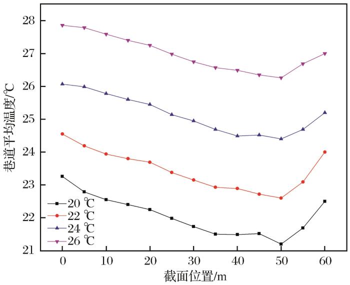 (1)风温参数优化。在分析风温对巷道温度场的影响时,保持入口速度为20 m/s、风筒高度为1.8 m,出风口距离作业面为10 m的前提下,选取入风温度为20,22,24,26 ℃,分别进行模拟,对比不同入风温度下掘进巷道内的温度场分布情况。各截面平均温度随入风温度的变化曲线如图6所示,由图6可以看出,随着入风温度的降低,各截面平均温度均有所下降,且不同温度下巷道平均温度整体变化趋势一致。但随着入风温度的升高,巷道内不同位置的温差逐渐减少。当入风温度为20 ℃时,巷道内各截面平均温度的最大温差为2.06 ℃;当入风温度上升至26 ℃时,巷道内各截面平均温度的最大温差下降至1.6 ℃。此外,当入风温度为26 ℃时,巷道最高平均温度为27.86 ℃,满足设置的目标值。由于局部通风机运行过程中产生一定的能耗,入风温度越低则耗能越多,且温度越低,与围岩发生的热交换越多,因此综合考虑通风降温经济性与降温效果,选取最佳入风温度为26 ℃。