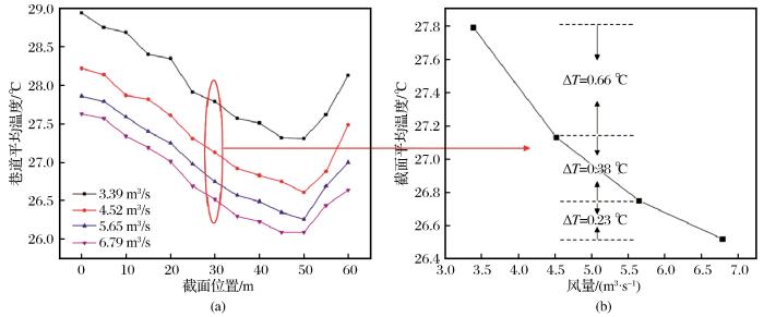 Change in average temperature of each section(a) and temperature difference of X=30 m section(b) under different ventilation air volume conditions