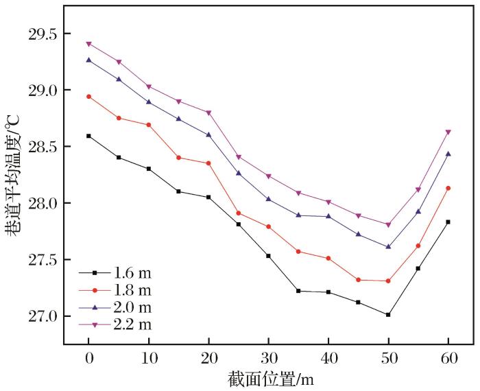 由图8可以看出,不同情况下巷道各截面平均温度沿巷道长度的变化趋势一致,且随着风筒架设高度的变化各截面平均温度变化不明显,不同风筒高度条件下平均温差极差约为1 ℃,因此得出风筒的架设高度对巷道降温的影响较小。当风筒架设高度为1.6 m和1.8 m时,巷道各截面平均温度均满足目标要求,且风筒高度为1.6 m时,巷道温度比风筒高度为1.8 m时下降幅度小于0.5 ℃。考虑到井下生产作业时,风筒架设过低会影响作业人员和车辆正常通行,因此选取最佳风筒架设高度为1.8 m。