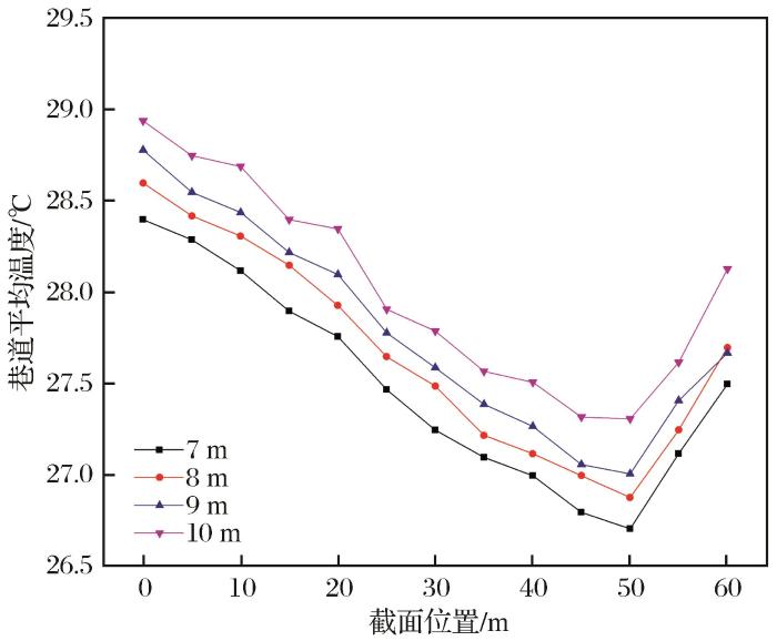 (4)出风口位置优化。风筒出口距作业面的距离不仅对作业面通风降温有重要作用,同时也是通风降尘过程中的关键因素,为了保证降温除尘效果,安全规程中要求风筒出口与作业面的距离不得大于10 m。因此,在风量为3.39 m3/s、风温为26 ℃、风筒架设高度为1.8 m的前提下,设置出风口与作业面距离分别为10,9,8,7 m,分析不同出风口位置对巷道温度的影响情况,并以各个截面平均温度作为参考,分析不同条件下截面平均温度的变化情况,通过模拟得到温度变化曲线,如图9所示。由图9可以看出,与入风温度、入风量和风筒高度相比,出风口位置对巷道温度的影响最小,不同出风口位置条件下,巷道平均温度极差约为0.7 ℃。随着出风口与作业面的距离减小,各截面平均温度呈下降趋势,当出风口与作业面的距离为10 m时,巷道平均温度最高为28.94 ℃,满足目标要求。