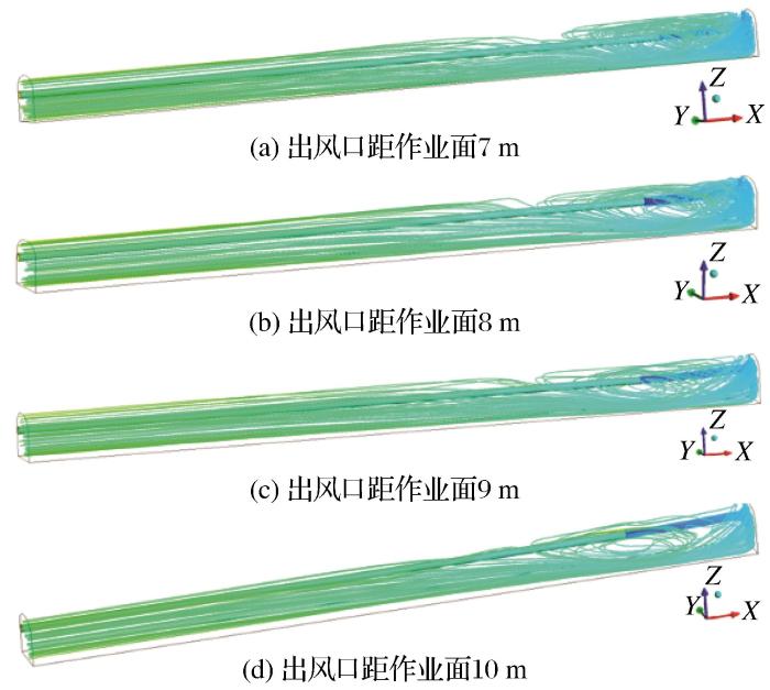 Airflow streamline diagram of roadway under different distances from air outlet to working face