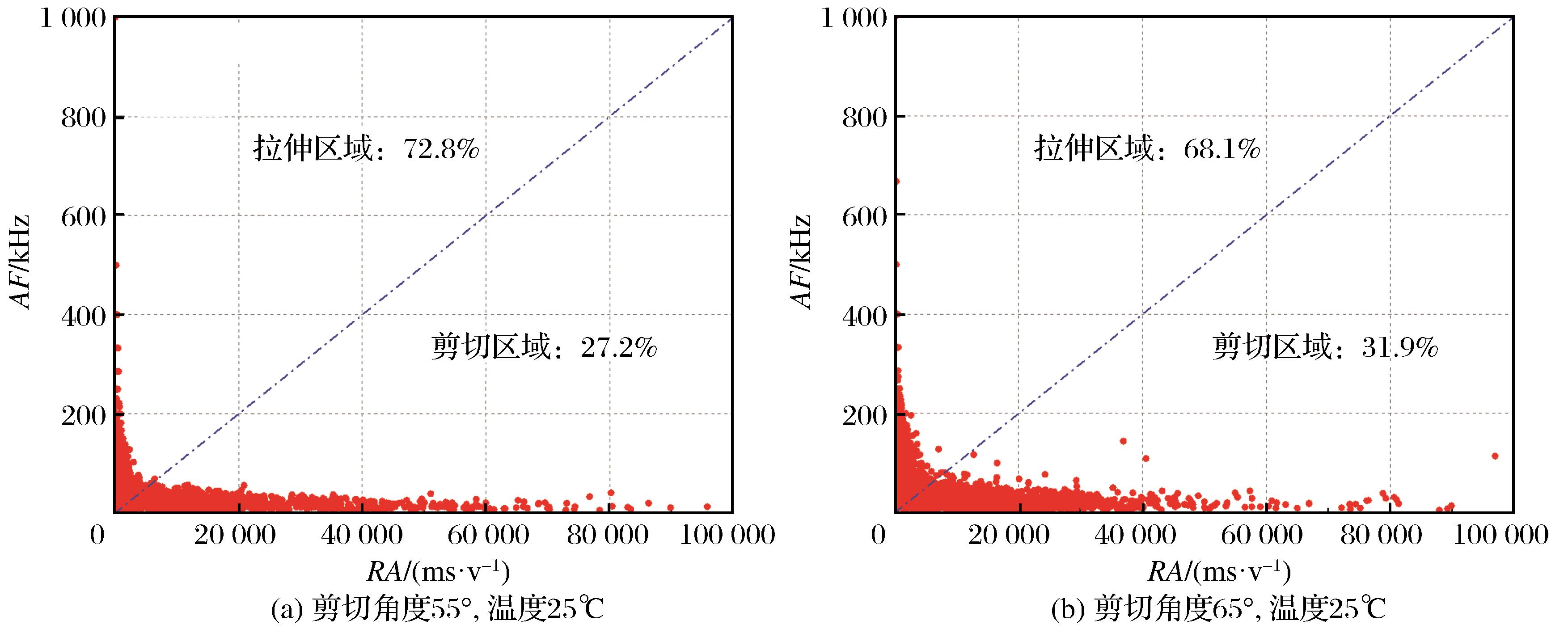 | 图5 常温下不同剪切角度红砂岩RA-AF散点分布 |