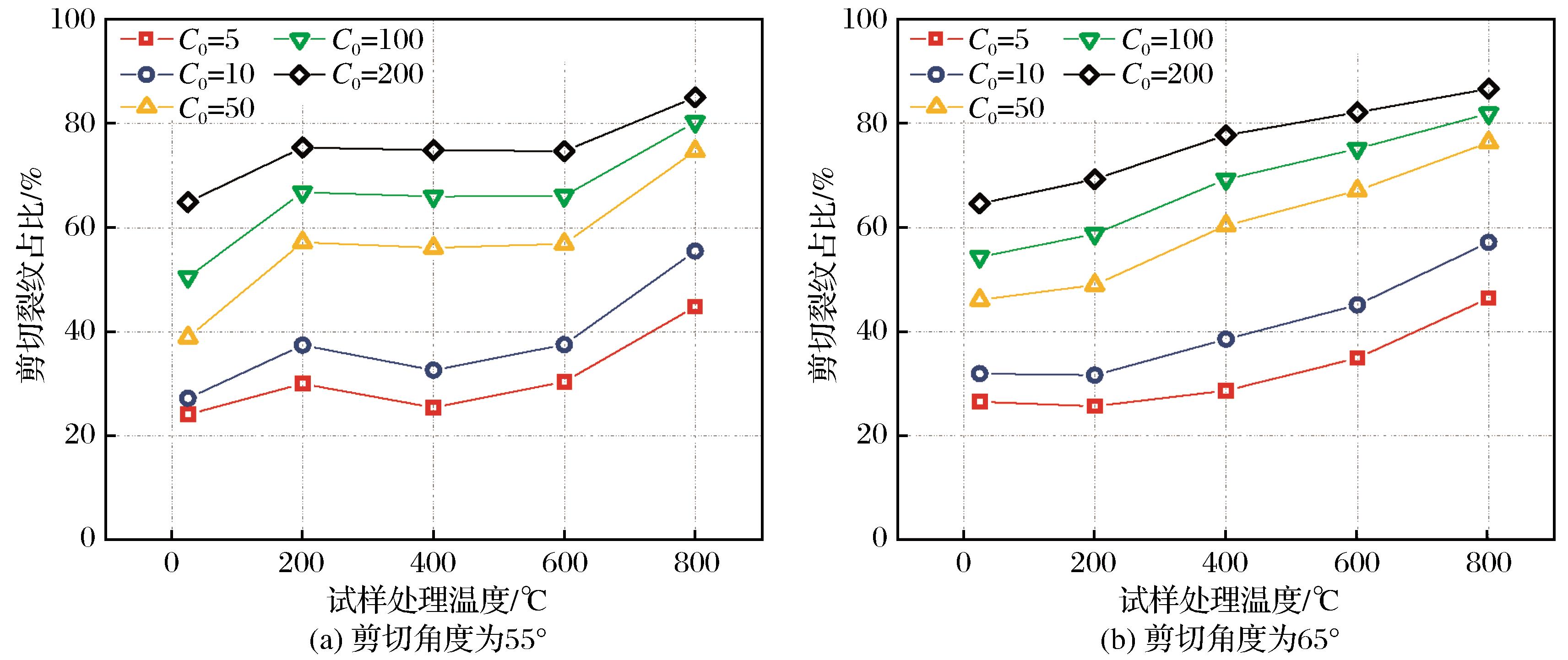 | Fig.6 Variation trend of shear crack proportion with treatment temperature corresponding to different C0 values |