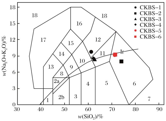 ... 1-橄榄辉长岩;2a-碱性辉长岩;2b-亚碱性辉长岩;3-辉长闪长岩;4-闪长岩;5-花岗闪长岩;6-花岗岩;7-硅英岩;8-二长辉长岩;9-二长闪长岩;10-二长岩;11-石英二长岩;12-正长岩;13-副长石辉长岩;14-副长石二长闪长岩;15-副长石二长正长岩;16-副长正长岩;17-副长深成岩;18-霓方钠岩/磷霞岩/粗白榴岩Total alkali-silicon(TAS)classification diagram of igneous rock system (base map after Middlemost,1994)Fig.43.2 微量元素地球化学特征
