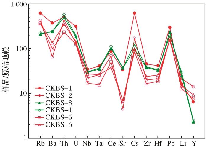 ... 伟晶岩微量元素Rb/Sr比值介于0.17~2.84之间,平均值为1.17,其中只有2件样品(CKBS-3和CKBS-4)的Rb/Sr比值小于0.5,说明伟晶岩形成过程中有幔源物质的参与,另外4件样品(CKBS-1、CKBS-2、CKBS-5和CKBS-6)的Rb/Sr比值及平均值均大于0.5,说明伟晶岩的物质来源主要位于壳源岩浆的Rb/Sr范围内(壳源岩浆Rb/Sr>0.5)(Tischendorf et al.,1985).伟晶岩样品中富含陆壳中丰度较高的Rb、Ba等不相容元素,暗示着物质来源主要与地壳有关.一般情况下,地壳岩石或其熔融体中TiO2含量较低(汪晓伟等,2015).本研究测试的6件样品中有3件样品(CKBS-2、CKBS-5和CKBS-6)的TiO2含量小于0.50%,说明伟晶岩的物质来源与地壳有关,另外3件样品(CKBS-1、CKBS-3和CKBS-4)的TiO2含量大于0.50%,进一步说明岩浆演化过程中有幔源物质的参与.陈西京(1976)认为深成伟晶岩(白云母伟晶岩)的形成深度为7~11 km,产于高压高温的铁铝榴石—角闪石变质相岩石中,中深伟晶岩(稀有金属伟晶岩)的形成深度为4~7 km,产于低压—中高温的堇青石—角闪石变质相岩石中.在LaN/YbN-δEu图解(图7)中,3件样品落在壳源范围内,另外3件样品落在壳幔源范围内,暗示着研究区含矿伟晶岩属于壳幔混合交代型,且经历了变质分异和重结晶作用,致使轻重稀土分馏程度较高.研究区内伟晶岩大多数出露于古元古界达肯大坂岩群中,岩相学特征显示,云母、长石和石英是伟晶岩的主要矿物组成,伟晶岩可能具有中深—深成伟晶岩的特点.