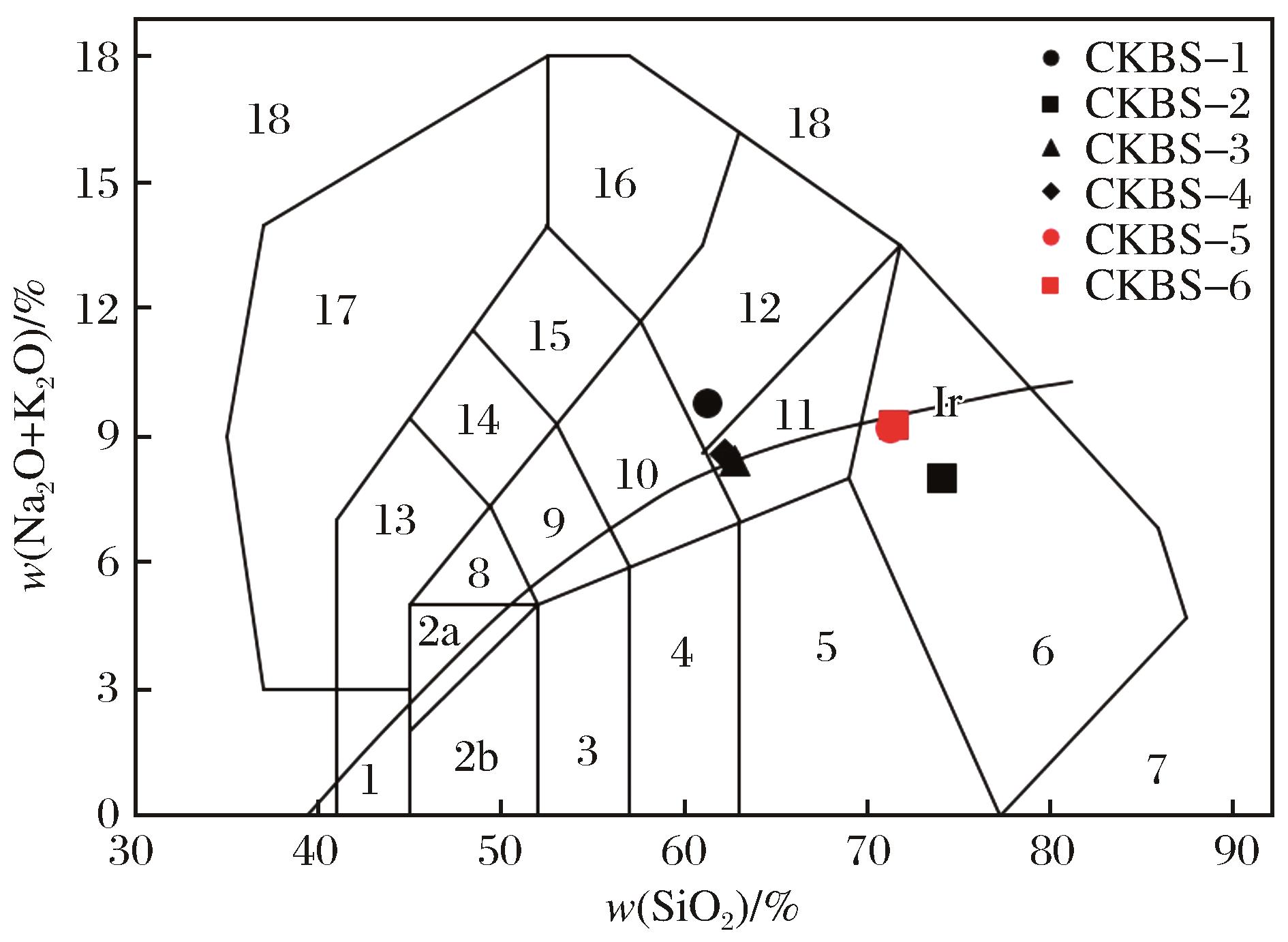 | 图4 火成岩系统全碱—硅(TAS)分类图(底图据 1-橄榄辉长岩;2a-碱性辉长岩;2b-亚碱性辉长岩;3-辉长闪长岩;4-闪长岩;5-花岗闪长岩;6-花岗岩;7-硅英岩;8-二长辉长岩;9-二长闪长岩;10-二长岩;11-石英二长岩;12-正长岩;13-副长石辉长岩;14-副长石二长闪长岩;15-副长石二长正长岩;16-副长正长岩;17-副长深成岩;18-霓方钠岩/磷霞岩/粗白榴岩 |