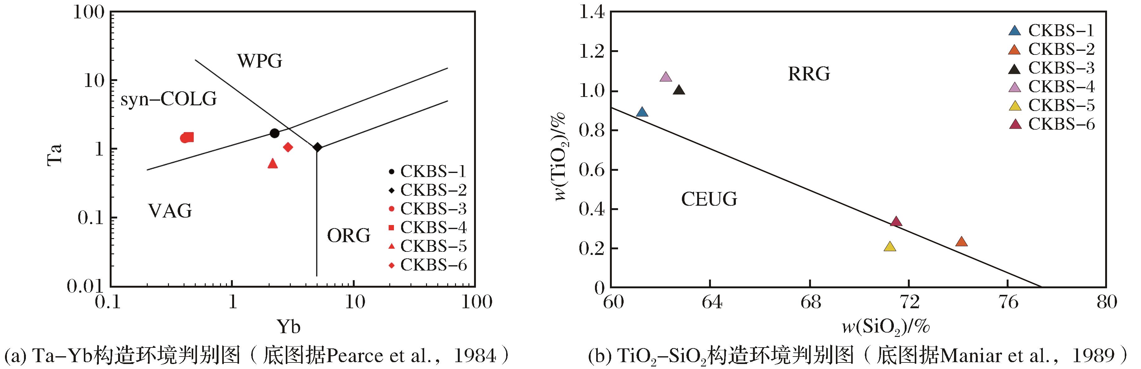 | 图8 构造环境判别图 VAG-火山弧花岗岩;syn-COLG-同碰撞花岗岩;WPG-板内花岗岩;ORG-洋脊花岗岩;RRG-与裂谷有关的花岗岩;CEUG-与大陆造山有关的花岗岩 |