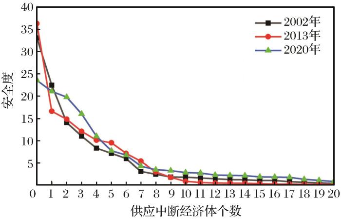 多元化是应对供应中断风险的重要途径(Hedenus et al.,2010),赫芬达尔—赫希曼指数(Herfindahl-Hirschman Index,HHI)是测量多元化水平的最常见指数,当前进口国家(地区)安全度指数及稳定性模型大多是基于HHI指数构建的(刘立涛等,2017)。安全度指数是衡量贸易网络稳健性和脆弱性的指标,通过对贸易网络进行目标性中断和随机性中断,研究网络的稳定性。刘立涛等(2017)基于HHI指数,通过加入石油进口来源国政治风险以及国家(地区)测地距离构建中国石油资源供应安全评价模型,研究中国石油贸易网络的稳健性和脆弱性;王芳等(2021)运用HHI指数构建中国木制林产品供应模型以及需求模型,分析中国木制林产品的供需安全。Ji et al.(2014)基于HHI指数,构建安全度模型,发现全球石油贸易网络呈现出“稳健但脆弱”的特点,即出口贸易中断的影响会蔓延到整个网络。Gupta(2008)通过修正的HHI指数,研究了石油进口国家(地区)供应网络的脆弱性。基于此,本文构建稀有矿产品供应安全模型,对中国稀有矿产品贸易网络进行目标性中断,观察安全度的变化特征,研究贸易网络的脆弱性,对中国稀有矿产品供应安全进行分析。