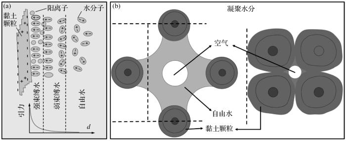 黏土颗粒带负电,会将极性水分子中带正电的部分吸引到带负电的黏土颗粒表层,在黏土颗粒与极性水分子形成扩散双层后,使有自由水存在的黏土基土壤发生膨胀,降低土壤强度(Thomas et al.,2021)。扩散双层的厚度取决于黏土矿物和孔隙水之间的化学作用过程,因此改变黏土和极性水之间的化学反应过程能够降低扩散双层的厚度(Das,2008)。黏土基土壤加入生物酶后,强大的离子交换优势使得扩散双层收缩,该过程可将黏土中的束缚水转变为自由水,并充斥在土壤颗粒间隙后被不可逆地排出,从而降低土壤的吸水能力,进而利用黏土将土壤颗粒和砂石等紧密黏结在一起(刘清秉等,2011;王昌衡等,2007),生物酶的作用原理如图1所示。