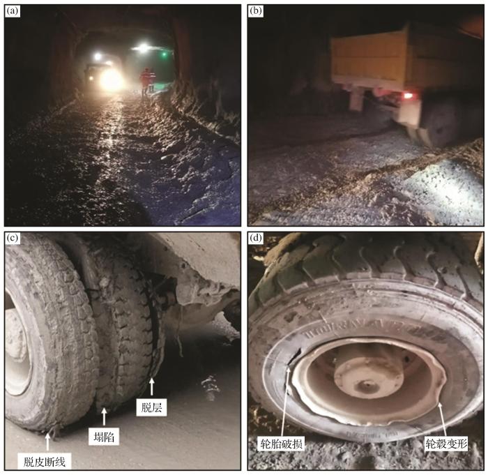 (a)主斜坡道混凝土路面情况;(b)矿车通行情况;(c)、(d)矿车轮胎磨损情况