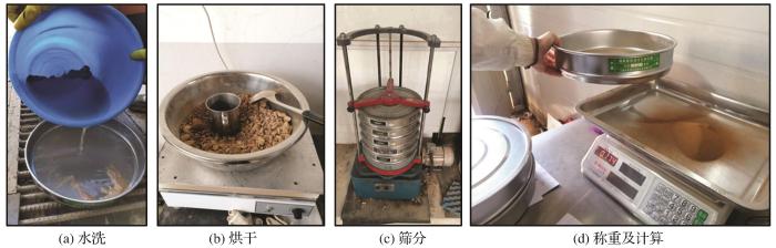 为确定浆土路中的黄黏土、机制砂、细集料和粗集料的配比,需要开展水洗筛分试验。采用四分法取样的方式进行精确取样后即可进行水洗筛分试验。试验包括水洗、烘干、筛分、称量和计算等步骤,从而得到混合料的粒径筛分结果。经过多次水洗筛分试验,最终确定出黄黏土、机制砂、细集料和粗集料的最佳配比为5∶6∶6∶3,水洗筛分试验流程如图7所示。