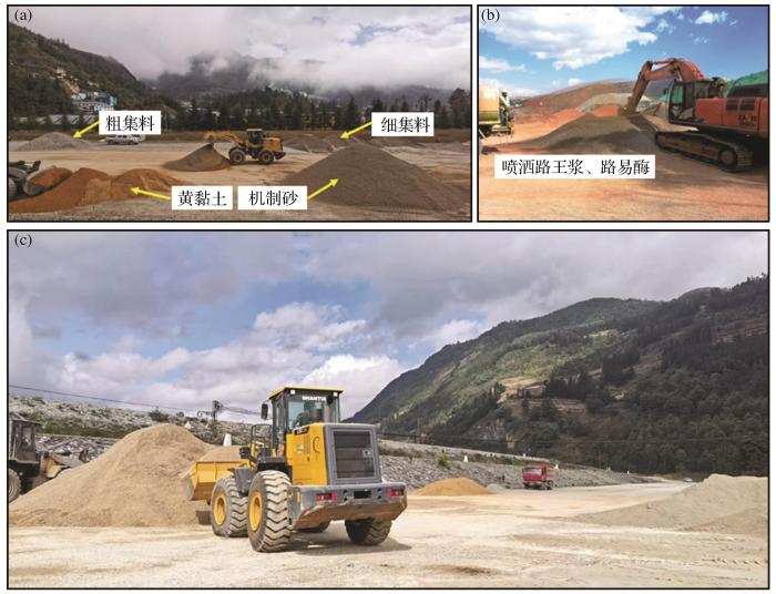 (1)施工准备。根据斜坡道筑路的宽度和厚度,首先计算出所需的材料用量,然后按照集料配比试验确定的最佳配比,利用机械加入相应的材料。同时按照路易酶用量为10 mL/m2,路王浆用量为1 200 mL/m2计算各自对应的量,加入到装有特定清水量的洒水车中,充分混合后均匀喷洒到集料堆中。喷洒过程需用挖机进行翻拌,使路易酶、路王浆充分与材料接触,最后利用装载机进行多次翻拌,使各种材料拌合均匀,材料准备过程如图8所示。