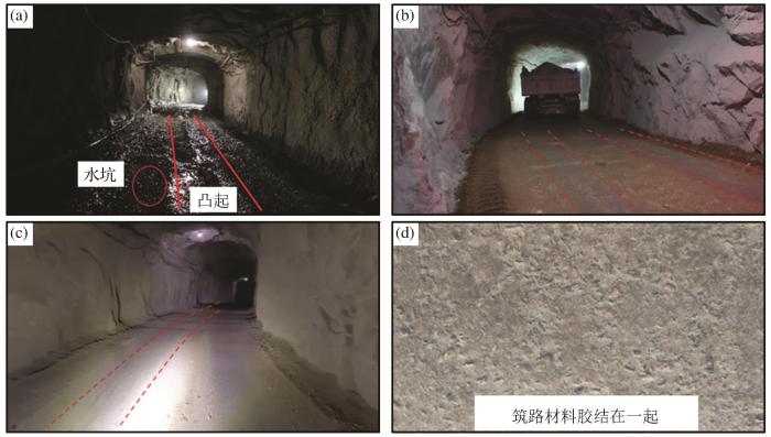 (3)应用效果。图10所示为卡房分公司同一位置的斜坡道路面在修筑前和修筑后的路面情况。从图10(a)中可以看出:斜坡道的原始路面坑洼不平、泥泞积水且中间隆起,道路质量极差,严重影响矿车通行。利用浆土路筑路技术进行斜坡道路面修筑后,路面敷设完成的当天即可允许重车通行,满载矿石的25 t载重矿车可以快速、平稳行驶,重车通行后检查路面无鼓包、凹陷、翻浆和搓板纹等情况,且抑尘、防滑效果好,如图10(b)所示;斜坡道浆土路通行半年后,道路质量依旧良好,重车固定行车轨迹的路面泛出如水泥路一样的光泽,路面平整度较好,黏土和砂石等材料胶结较好,无明显的凹陷和隆起,道路质量高,如图10(c)~10(d)所示。通过开展正常车速下坡行驶的急刹车试验,得到刹车距离短且不发生偏移,说明浆土路的防滑效果良好。