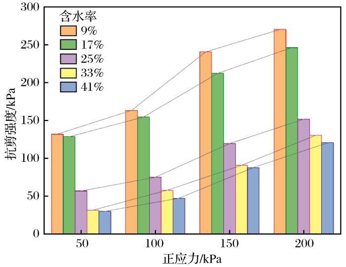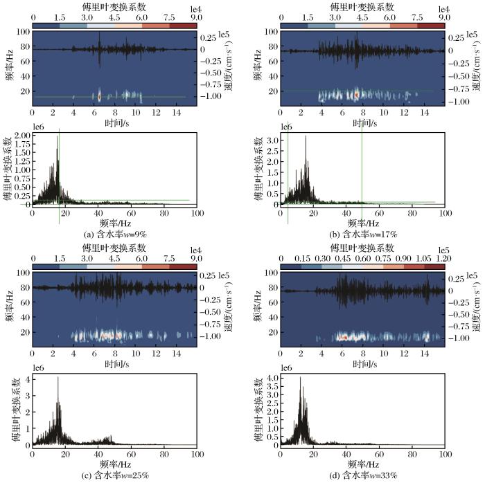 ... 为了得出不同含水率试样剪切过程微震信号的频谱特性以及频域内的能量分布特征,本试验设置了4种不同含水率(分别为9%、17%、25% 和33%)的重塑试样,在含水率为41%的手摇直剪试验中,根据试验现象及数据规律,含水率为41%的试样处于过饱和状态,在固结排水直剪试验初期,过饱和浸矿液渗出使得土体含水率降低,因此得出的试验微震数据准确性不高,在信号分析中,该组微震信号被剔除.为了避免试样制作误差和试验操作差异,每种含水率做6组平行试验,取重复得到且具有相似图像特征的试验数据进行处理.本试验采用手摇剪切—微震监测试验设备,模拟稀土试样土颗粒剪切摩擦作用,设备及试验介绍详见1.2小节.准确记录试验开始时间和结束时间,并确保所有试样剪切速率和时间(10 s)相同.在处理数据时,三通道信号中南—北与东—西方向信号类似,垂直方向与之无关联,只选取传感器与剪切装置布置方向对应的南—北通道微震数据.试验中参照北京时间开始和结束,根据采集仪器内置的协调世界时(UTC)与标准北京时间的差值确定试验时间,对所有试样测出的信号进行裁剪预处理,裁剪时长为16 s.基于Python的Scipy高通滤波(滤除低4 Hz)和PyWavelets小波变换(Lee et al.,2019)对每种含水率试验样本微震信号进行处理,获得剪切摩擦信号的时频图像和频域分布图.限于本文篇幅,每种含水率选取一组典型试验结果.图8(a)~8(d)分别是含水率为9%、17%、25%和33%试样的剪切摩擦微震信号波形—时频—频域分布图.值得一提的是,波形图和时频图同在一张图像中,其中左纵坐标为时频图频率,右纵坐标为波形图振幅,时频图彩色图例为傅里叶变换系数(FFT Coefficients,FFTA),反映某频段下信号能量大小. ...