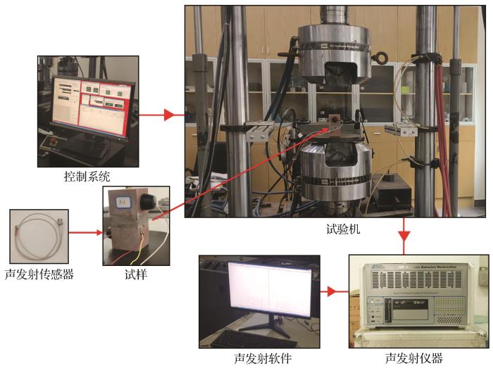 使用MTS322电液伺服控制试验机(最大加载量程为500 kN,加载精度为±0.5%)对试样进行单轴压缩试验,并采用美国PAC公司的PCI-2声发射仪监测试验过程中产生的声发射现象。2个谐振频率为125 kHz的Mini300型传感器,分别粘贴于试样上下两侧居中的位置。