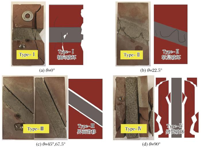 不同倾角试样试验中的破坏结果和破坏模式分类示意图