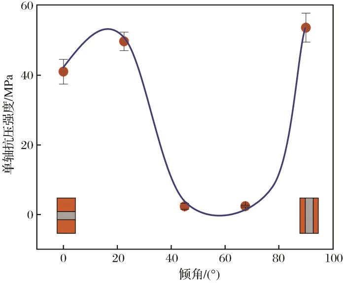 20世纪80年代起,以Jeager为代表的研究人员对带节理的各向异性岩石进行了大量研究,并提出了单一强度弱面理论(Jaeger,1960;Duveau et al.,1998;Ramamurthy.,1993)。不同种类各向异性岩石在单轴压缩下的强度特性往往表现出符合单一弱面理论的规律,其破坏模式和层理倾角也有着对应关系(Cho et al.,2012;刘运思等,2012;刘胜利等,2012)。对互层岩石的大量研究表明,倾斜互层岩石的单轴抗压强度随着倾角的增加呈现先减小后增大的U型变化(Gholami et al.,2014;Zhang et al.,2020)。Mokhtari et al.(2016)对倾斜互层岩石的抗拉强度与倾角关系进行了研究,发现互层岩石抗拉强度随着倾角与受力方向夹角的增加呈减小趋势。倾斜互层岩石的破坏模式往往与倾角有着很强的对应关系,对破坏模式进行分类是互层岩石研究中常见的研究方向。Tien et al.(2006)对层状岩石在单轴压缩下的破坏模式进行研究,提出了与倾角相对应的3种破坏模式。外部因素的改变也会对层状岩石的各向异性程度产生影响,Zhang et al.(2020)研究发现层状岩石在受到水侵蚀时各项异性会增强。计算机技术也越来越广泛地应用到层状岩石的研究之中。Yeh et al.(2020)利用数值模拟技术对层状弱胶结沉积岩边坡的稳定性进行了分析,发现边坡的各层倾角对边坡稳定性具有显著影响。