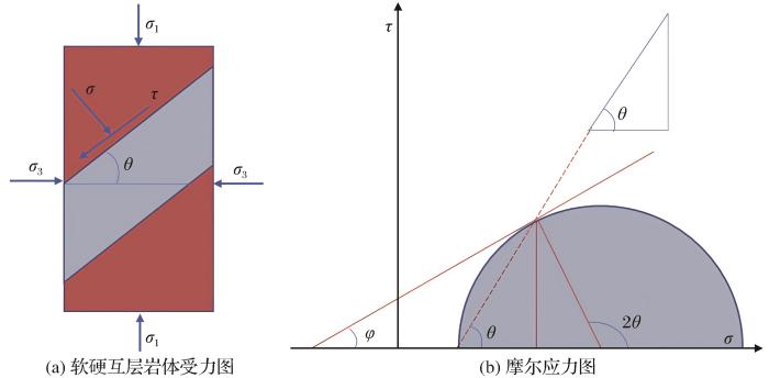 当倾角为22.5°时,试样抗压强度上升现象可以用Mohr-Coulomb破坏准则解释(Jaeger et al.,1981)。在自然状态下,软硬互层岩体主要受到地应力和围压的影响,受力状况如图5(a)所示。其中σ1和σ3分别为岩石受到的最大主应力和最小主应力,σ和τ分别为作用于软层弱面的法向应力和剪切应力,θ为软层与水平面的夹角。由摩尔应力圆理论,作用于软层面的法向应力σ与剪切应力τ分别为