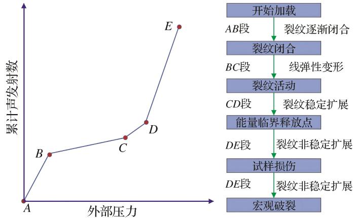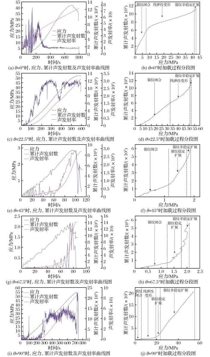 不同倾角下应力、累计声发射数和声发射率曲线图及加载过程分段图