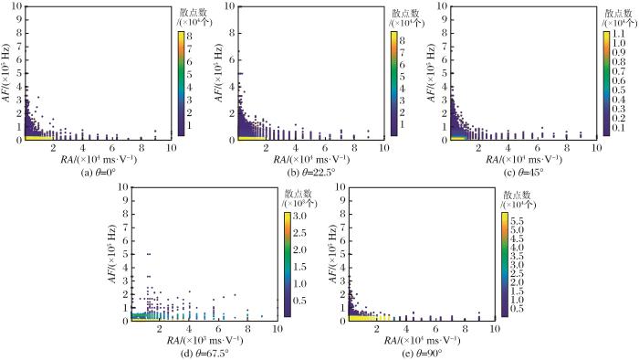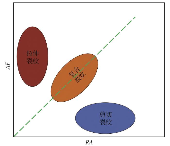 利用声发射的RA-AF值对裂纹类型进行评判是岩石混凝土试验中的常用方法。声发射测量系统收集的声发射参数(如持续时间、声发射次数、振幅、能量和上升时间等),如图9所示。RA值代表声发射数据中上升时间与幅值的比值。AF值代表声发射信号的平均频率。不同类型的裂纹在产生、发展过程中的声发射波形特性不同,一般认为RA值较高的信号属于剪切裂纹,AF值较高的信号属于拉伸裂纹。采用JCMS-III B5706(Farhidzadeh et al.,2013)对拉伸裂纹和剪切裂纹进行区分,如图10所示。